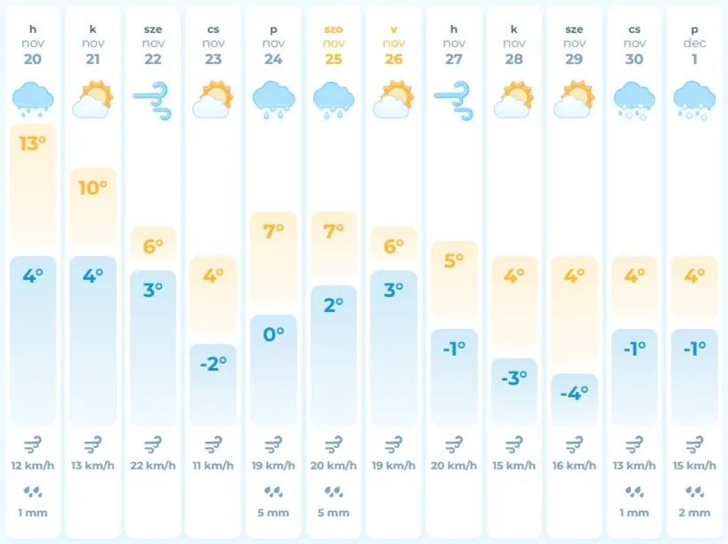 A most következő hétvégén azonban megérkezik az igazi tél. A front mögött gyakran szeles, egyre hidegebb időre van kilátás. Szombaton még 2 és 7, vasárnap már csak 0 és +5 fok között alakulhatnak a nappali maximumok. Országszerte számítani lehet a tartós fagyokra.