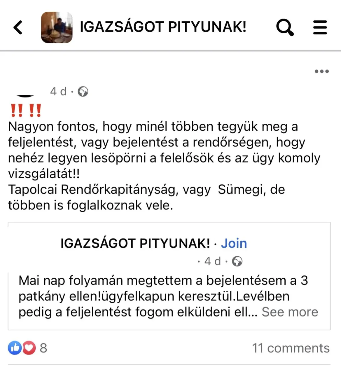 „Nagyon fontos, hogy minél többen tegyük meg a feljelentést, vagy bejelentést a rendőrségen, hogy nehéz legyen lesöpörni a felelősök és az ügy komoly vizsgálatát! Tapolcai Rendőrkapitányság, vagy Sümegi, de többen is foglalkoznak vele” – írta egy másik aktív csoporttag.