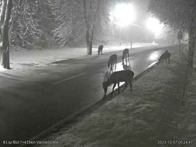 A 83-as főúton, Farkasgyepűnél csütörtök hajnalban(december 7.) az egyik kameránkon szarvasok és borjaik jelentek meg, nem is kevesen. De miért? Hát azért, hogy az útra kiszórt sót felnyalogassák. Szerencsére maradt még utána is só a burkolaton, mert a legfrissebb kameraképünkön is fekete az út, a mellette lévő terület pedig szép havas.
