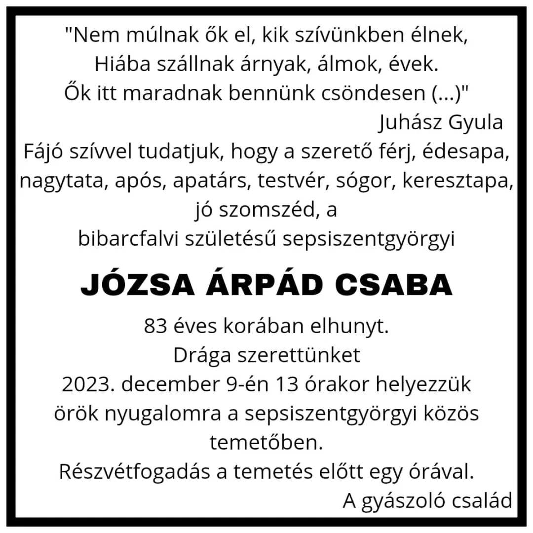 Nyolcvanhárom éves korában elhunyt Józsa Árpád Csaba, aki egyike volt azoknak az erdélyi iskolásoknak, akik 1956-ban félelmet nem ismerve elindultak Magyarországra, hogy segítsék a magyar forradalmárokat. A baróti diákok csoportjából már csak ő élt.