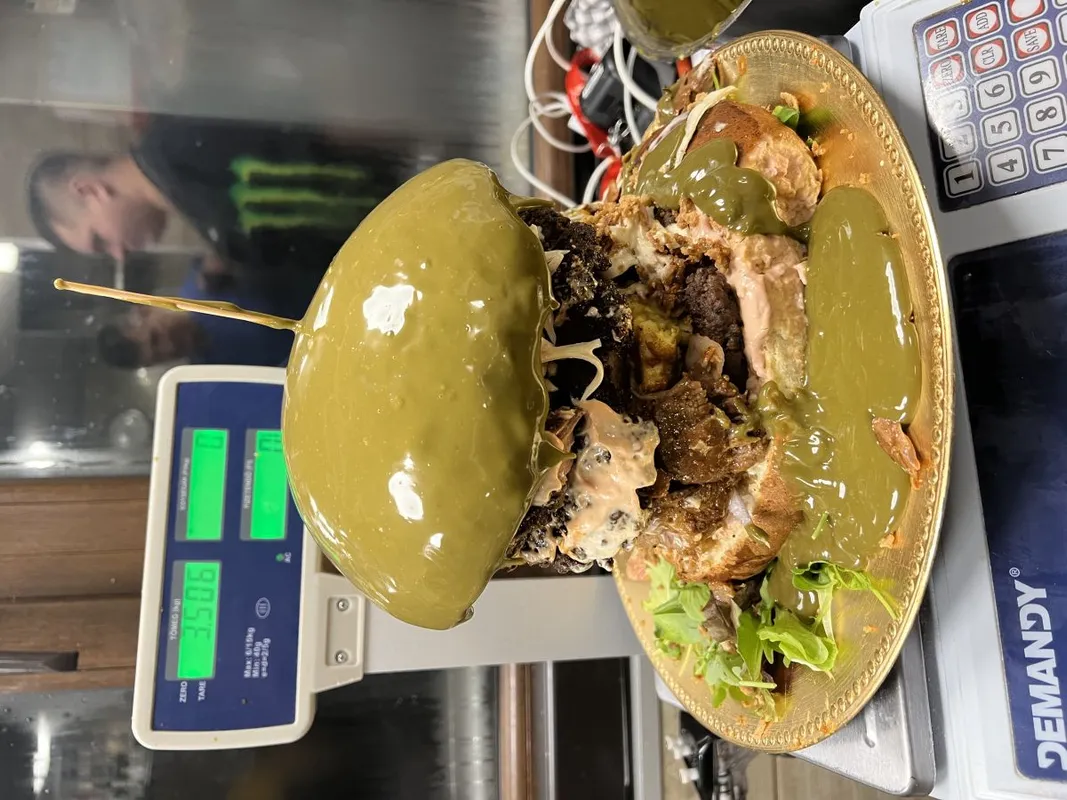 Egy hamburgerbe 1700 gramm marhahús, 800 gramm tépett malachús, 500 gramm buci, bacon, 250 gramm hasábburgonya tojásban beforgatva, paradicsom, lilahagyma, saláta, uborka, valamint egy különleges, fekete fokhagymapasztával ízesített cheddar sajtszósz kerül