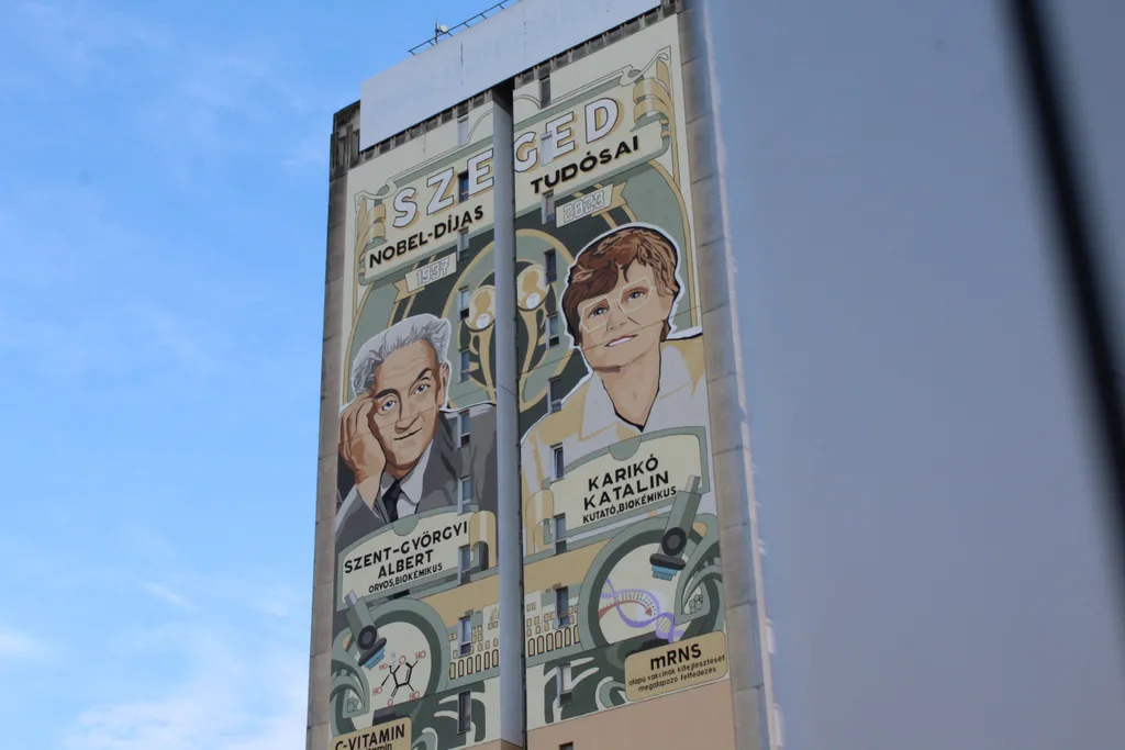 Nem akárhogy tisztelgett Szeged a két Nobel-díjasa előtt. Karikó Katalin és Szent-Györgyi Albert sok szálon kötődik a napfény városához, épp ezért döntött úgy a helyi vezetés, hogy a legnagyobb épületük falára festik arcképüket. Képeken mutatjuk a Nobel-díjasok közös, monumentális freskóját!