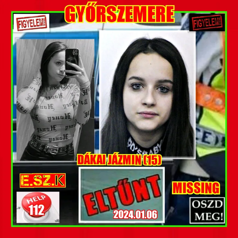 Jázmin körözési adatlapját ITT tudod megnézni, Erik adatlapját pedig ITT. Jázmin 158 cm testmagasságú, normál testalkatú, kékeszöld szemű, hosszú világosbarna haja van, szemüveget hord. Eltűnésekor viselt ruházata: térd alá érő fekete kapucnis kabát, szürke pamut melegítő, magas szárú, fehér színű, "DRK" feliratú cipő, fehér fülvédős hajpánt.