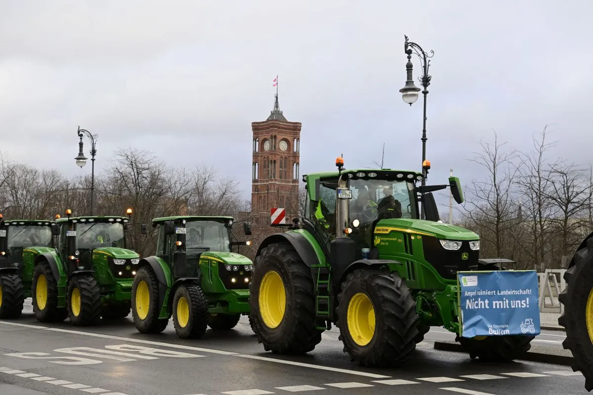 Hétfőn gazdálkodók és szállítmányozók ezrei gyűltek össze nehézgépekkel a berlini Brandenburgi kapu környékére szervezett tüntetésre. Becslések szerint jóval több mint 5000 jármű, traktor és teherautó érkezett a fővárosba – idézték német lapok a rendőrség szóvivőjét. Az egy hete kezdődött országos tiltakozásokon a gazdák a szövetségi kormány megszorító politikája, a több mint 70 éve fennálló mezőgazdasági gázolaj-kedvezmény megszüntetése ellen tüntettek. A kormány látva a gazdák haragját, visszavonta a mezőgazdasági gépjárművekre kivetni kívánt adót.