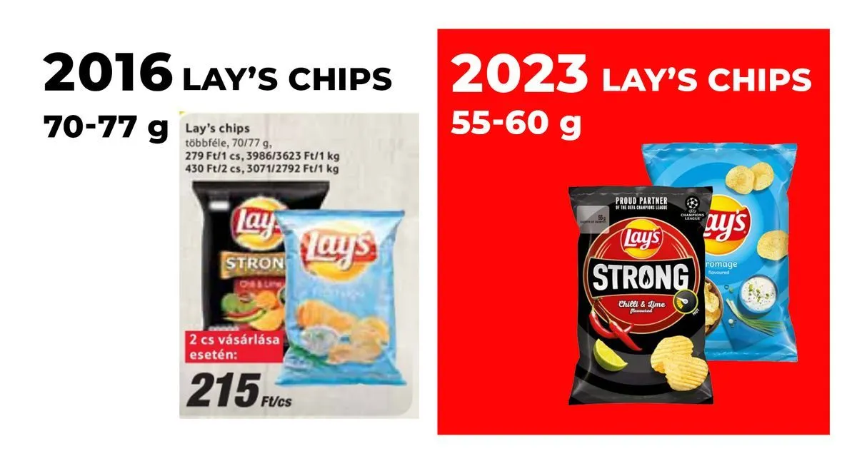 Mondunk egy példát: Egy zacskó chips például 400 forintba került egy éve, de a gyártó időközben emeli az árát 20 százalékkal – látszólag árváltozás nélkül, de ötödével kevesebb chips került a zacskóba.