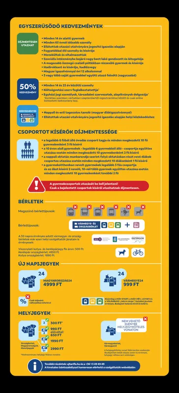 - 14 év alatt és 65 év felett mindenki számára díjmentessé válik a közösségi közlekedés, illetve a 90 százalékos kedvezmény kategóriában utazóknak is ingyenessé teszik a tömegközlekedést Magyarországon. Közéjük tartoznak azok a nagycsaládosok is, akik eddig igénybe vették a nagycsaládosok utazási kedvezményét. Ez a szülő és a vele együtt utazó legalább 3 gyermek együttes utazására vonatkozik, a személyazonosság és a feltételek igazolására alkalmas okmányok felmutatásával. Az oktatásban és egészségügyben dolgozóknak, valamint a 14 és 25 év közöttieknek korlátlan utazást biztosítanak 50 százalékos kedvezménnyel;