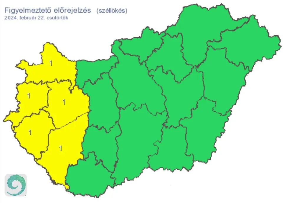 Csütörtökön erősen felhős, vagy borult időre számíthatunk. Elsősorban délutántól várható csapadék a keleti tájakon. Többfelé viharossá fokozódik a délnyugati szél. 14 fok köré erősödik a nappali felmelegedés. Napközben (nagyobb eséllyel a déli, délutáni órákban) a Dunántúl nyugati felén előfordulhatnak viharos (ált. 60-70 km/h, néhol >70 km/h) széllökések.