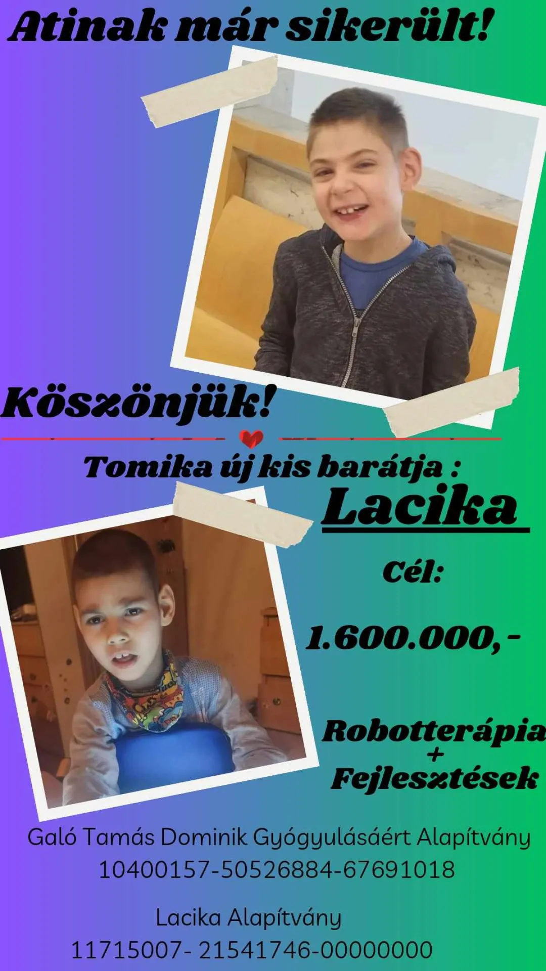 Tomika Édesanyja a legváratlanabb és legreménytelenebb pillanatban keresett fel engem és nyújtott segítő kezet a családunknak. Felajánlotta, hogy segítenek pénzt gyűjteni a robotterápiára, valamint kiegészítő terápiákra. Hálás szívvel köszönjük!