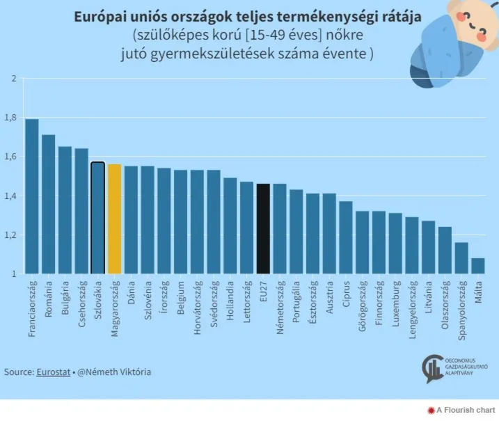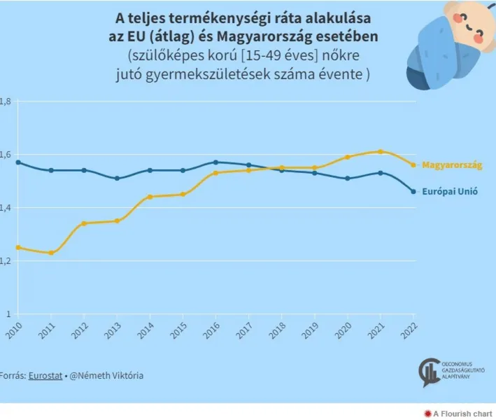 Az Európai Unióban a 2021-es 1,53-ról 2022-re 1,46-ra csökkent a teljes termékenységi arányszám. A borús európai trendek ellenére azonban a magyar adat lett a hatodik legkedvezőbb, ugyanis az 1,56-os mutató meghaladja az EU-s átlagot - írja a jelentést szemléző és magyarázó Oeconomus Gazdaságkutató Alapítvány. A számok azt mutatják, hogy az elmúlt évek válságai Európa-szerte rányomták bélyegüket a születések arányára.