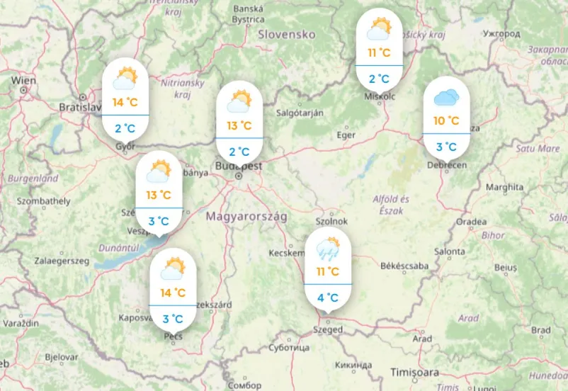 Szinte semmit nem változik az időjárás a heti kínálathoz képest: egy kis eső, egy kis felhő, egy kis napsütés és egy kis szél lesz ma is terítéken. A borongós tájakon a felhőzet gomolyosodik, máshol pedig a napos idő után várható gomolyfelhős ég. Elvétve ezekből zápor előfordulhat. Általában véve gyenge marad a légmozgás, viszont az északnyugati, északi szelet néhol kísérhetik élénk lökések is. A legmagasabb nappali hőmérséklet 11 és 16 fok között alakul majd a hideg, reggeli 2-3 fok után.