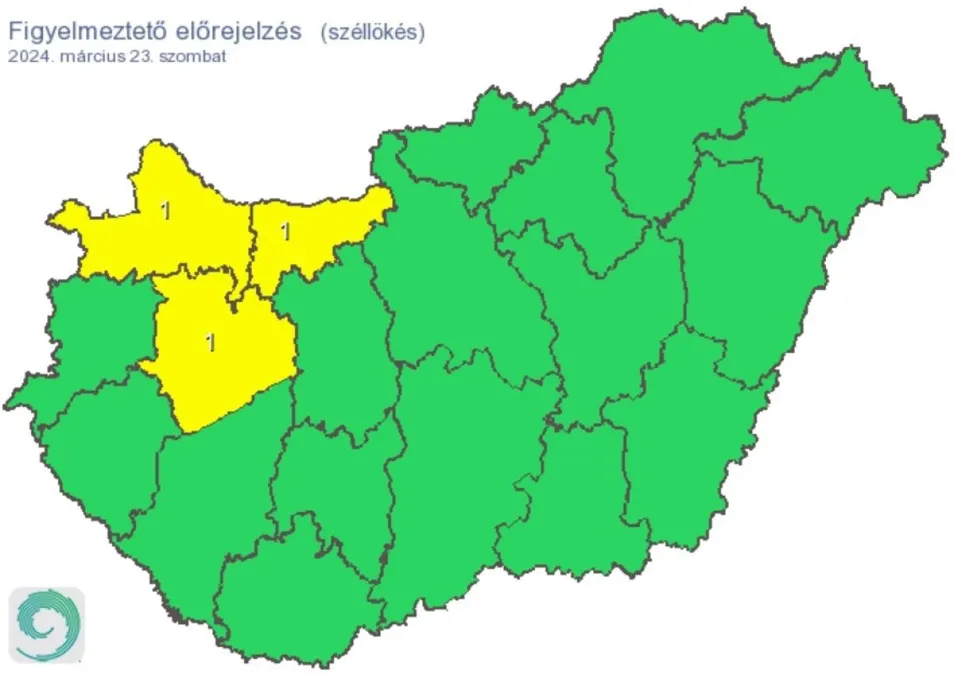 A Hungaromet elsőfokú riasztást adott ki viharos szél miatt Győr-Moson-Sopron, Komárom-Esztergom és Veszprém vármegyékben. Várhatóan délután északnyugat felől egy hidegfront érkezik, amely fokozatosan kelet felé halad. A fronthoz kapcsolódóan viharos széllökés (ált. 70-80 km/h, magasabban fekvő területeken, Balaton környezetében ennél több is) várható, illetve helyenként (főként északnyugaton) zivatar sem kizárt.