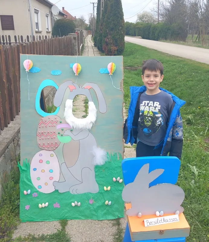 A 6 éves Gergő és anyukája, Szigeti Veronika szívmelengető húsvéti programot talált ki: sajátkezűleg készítettek egy nyuszit ábrázoló fotófalat, amire többek között gondosan ragasztottak tojásokat és gyöngyöket is. A fiú hétvégénként kiül a házuk elé a fallal és egy becsületkasszával, hogy az arra járók fotózkodhassanak az alkotásával. A család egy Vas vármegyei kis faluban, Kisunyomon él .