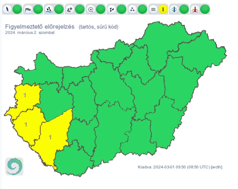 Citromsárga riasztást adott ki három vármegyére a Magyar Meteorológiai Szolgáltató Nonprofit Zrt. Veszélyjelzésükben arra figyelmeztetnek, hogy Somogy, Vas és Zala vármegyében is tartós, sűrű ködre kell majd számítani a mai nap folyamán.