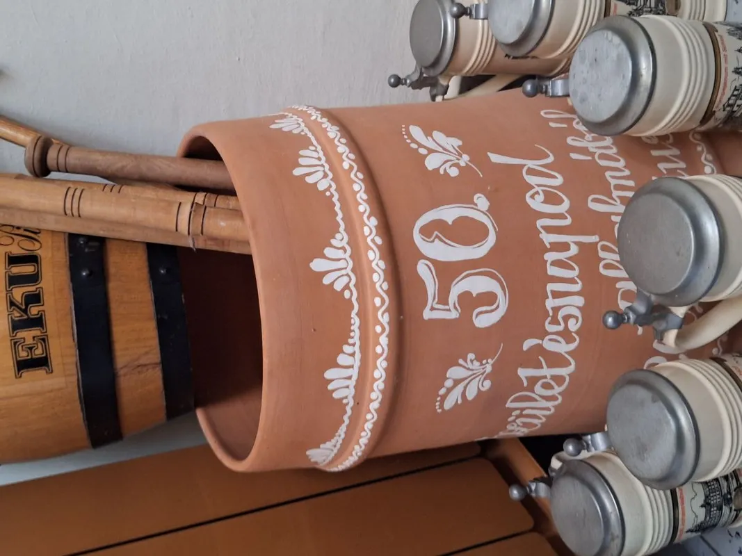 "A legnagyobb és a legkisebb korsómat is a születésnapomra kaptam. Előbbi egy vásárhelyi keramikus alkotása, 20 literes. Utóbbi mindig a nyakamban lóg, ez egy 2 cl-es 14 karátos aranyból készült korsó, melyet a 60. születésnapomra kaptam" – árulja el Sándor.