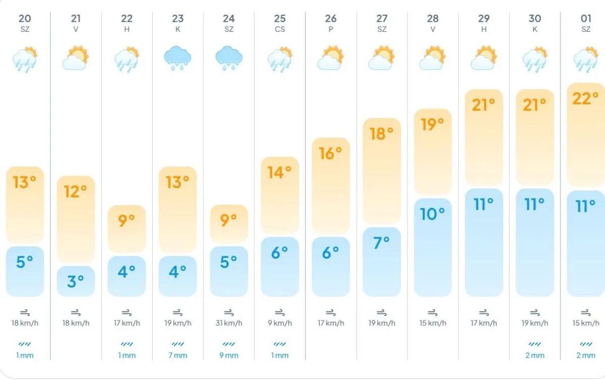 Brutális hét előtt állunk, a télből egy hét leforgása alatt átmegyünk tavaszba. A hétfő egyenesen sokkoló lehet, ugyanis 9 fokra lehűl a nappali hőmérséklet. Erre a napra ne tervezzünk a szabadban kirándulást, vagy más fizikailag megterhelő programot.
