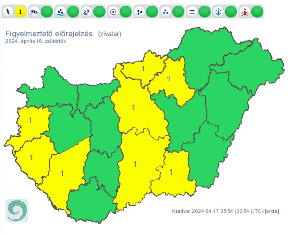 Kiadta a veszélyjelzést a HungaroMet Nonprofit Zrt. A mai napon több vármegye is citromsárga riasztást kapott zivatar miatt, ahol az elsődleges veszélyforrást a villámlás jelenti, emellett esetenként szélerősödés, jégeső is előfordulhat.