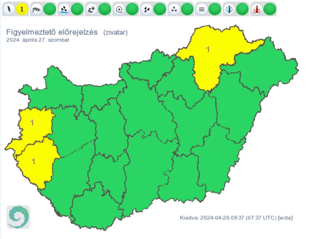 A nap első felében több, délután már kevesebb lesz a gomolyfelhő - jósolja a mai napra a Köpönyeg. Egyébként sok napsütésre van kilátás, mialatt elszórtan zápor is előfordulhat. 20 fok köré melegszik a levegő. Mindeközben a HungaroMet Nonprofit Zrt. három vármegyére citromsárga riasztást adott ki zivatar miatt: az elsődleges veszélyforrást a villámlás jelenti, emellett esetenként szélerősödés, jégeső is előfordulhat.