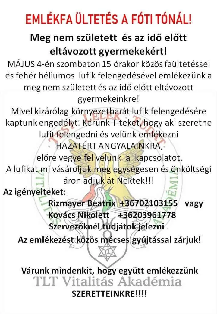 A rendhagyó anyák napját május 4-én 14 órától rendezik meg a Fóti tónál. Az eseményen videót vetítenek az elhunyt gyermekek fényképes összeállításából és héliumos, környezetbarát lufikat engednek a magasba, valamint ültetnek egy fát, végezetül pedig mécsest gyújtanak. Több, mint 100 résztvevőre számítanak; az eseményt online is közvetítik azok számára, akik nem tudnak személyesen jelen lenni.