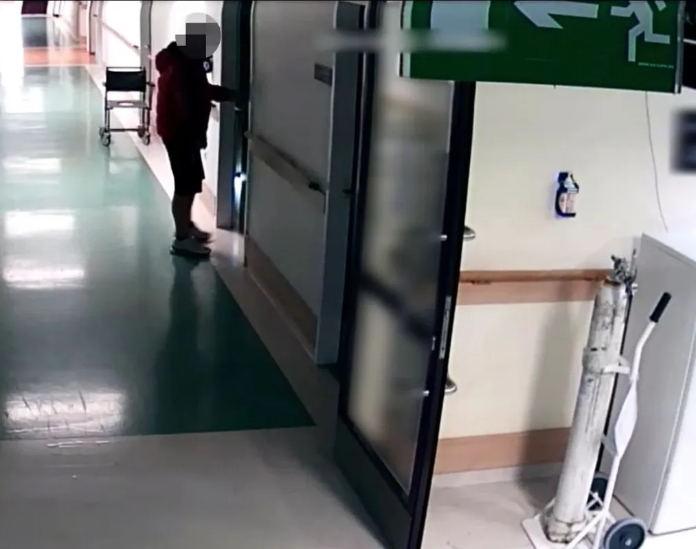 A biztonsági kamera felvételén a férfi látható, amint a kórház folyosóján az egyik betegszobába bemegy, majd kisvártatva kijön és ezt követően pedig egy újabb betegszoba előtt is megáll: