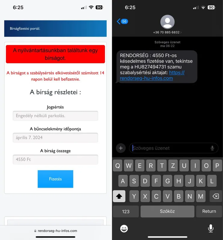 Az oldal, amelyre a szöveges üzenetben kapott link mutat egyébként már eleve gyanús, hiszen a rendorseg-hu-infos.com linkről már kizárólag a fizetés gombra lehet kattintani.