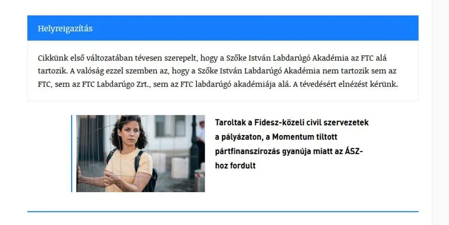 Bár maga a momentumos politikus kínosan ügyelt arra, hogy az idén 125 éves, kétmillió szurkolóval rendelkező sportklubot ne kösse össze a IX. kerületi akadémiával, a balos „tényellenőrző” újságíróknak ez már nem sikerült, így olyan címek születtek, mint "a Fradi utánpótlás akadémiája méregdrága Teslákat vett állami támogatásból". Csakhogy ebből egy szó sem volt igaz: ezt az is bizonyítja, hogy szinte azonnal eleget tett mindhárom oldal az FTC helyreigazítási kérelmének, kénytelenek voltak szégyenszemre kijavítani a cikket és kitenni egy helyreigazítást.
