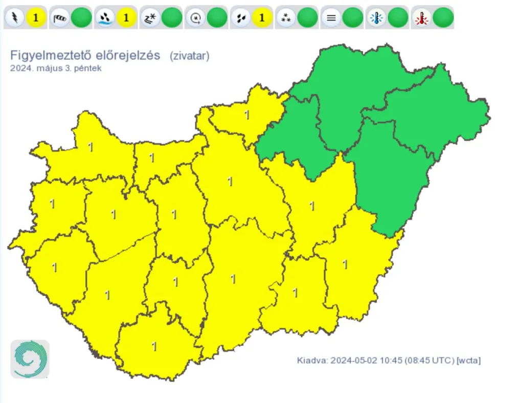 A HungaroMet Nonprofit Zrt. veszélyjelzésében a mai napra csaknem az egész országra citromsárga riasztást adott ki zivatar miatt: az elsődleges veszélyforrást a villámlás jelenti, emellett esetenként szélerősödés, jégeső is előfordulhat. Emellett több vármegye kapott ugyancsak citromsárga riasztást az eső, és felhőszakadás miatt is.