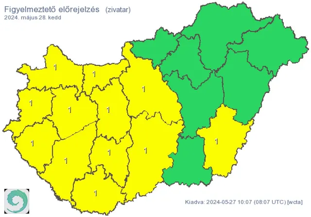 Kedden többórás napsütés várható, gomolyfelhőkkel. Eleinte inkább csak a Nyugat-Dunántúlon, majd estétől máshol is előfordulhat zápor, zivatar. Napközben 25-26 fok várható. A Hungaromet Nonprofit Zrt. elsőfokú riasztást adott ki a zivatarok miatt Pest, Baranya, Bács-Kiskun, Békés, Fejér, Győr-Moson-Sopron, Komárom-Esztergom, Somogy, Tolna, Vas, Veszprém és Zala vármegyére. Ezeken a területeken villámlásra, erős szélre és jégesőre is készülni kell! A felhőszakadás miatt Győr-Moson-Sopron, Somogy, Vas és Zala vármegye kapott figyelmeztetést!