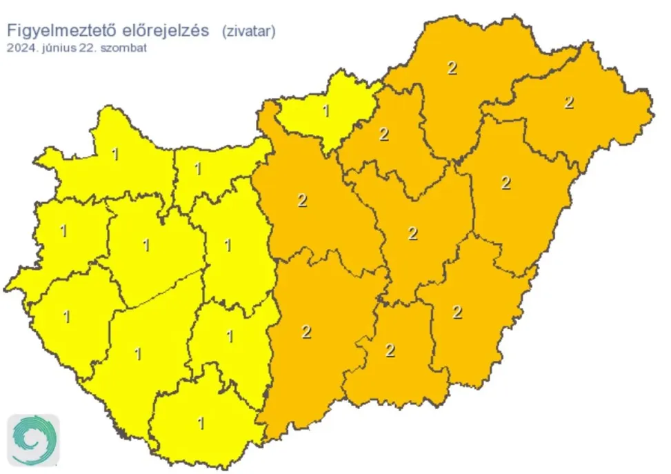 Sőt a HungaroMet figyelmeztető előrejelzés adott ki Magyarország területére 2024.06.22. szombat éjfélig. Szombaton napközben kiemelten az ország délkeleti, keleti felén valószínű zivatartevékenység. Ekkor már heves zivatarok kialakulásához is - nagy területen és akár több hullámban is - kedvezőek lesznek a feltételek. A zivatarokat általában viharos erejű szél (> 60 km/h), intenzív csapadékhullás, valamint jégeső ( < 2 cm) kísérheti. Heves zivatar esetén erősen viharos ( > 90 km/h) széllökés, nagy méretű jég (ált. 2-5 cm, egy-egy helyen akár 5 cm-t meghaladó átmérőjű), valamint felhőszakadás (ált. 30 mm körül, néhol akár > 50 mm) fordulhat elő. Várhatóan szombatról vasárnapra virradó éjszaka sem csillapodik a zivatartevékenység.