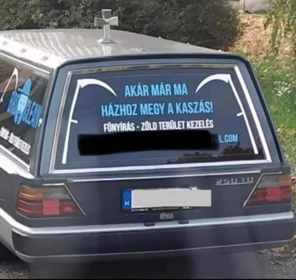 A napokban felrobbantotta a hazai internetet egy fotó, amely bejárta a különböző közösségi média- és híroldalakat. Már önmagában az is kellő humorérzékre utal, ha kertrendezési és/vagy fűnyírási munkát végző vállalkozásként valaki azzal matricázza fel a céges járgányt, hogy „Akár már ma házhoz megy a kaszás!” Ha azonban ez a bizonyos céges autó egy halottaskocsi, az már a gerillamarketing egyik legmagasabb foka. Íme: