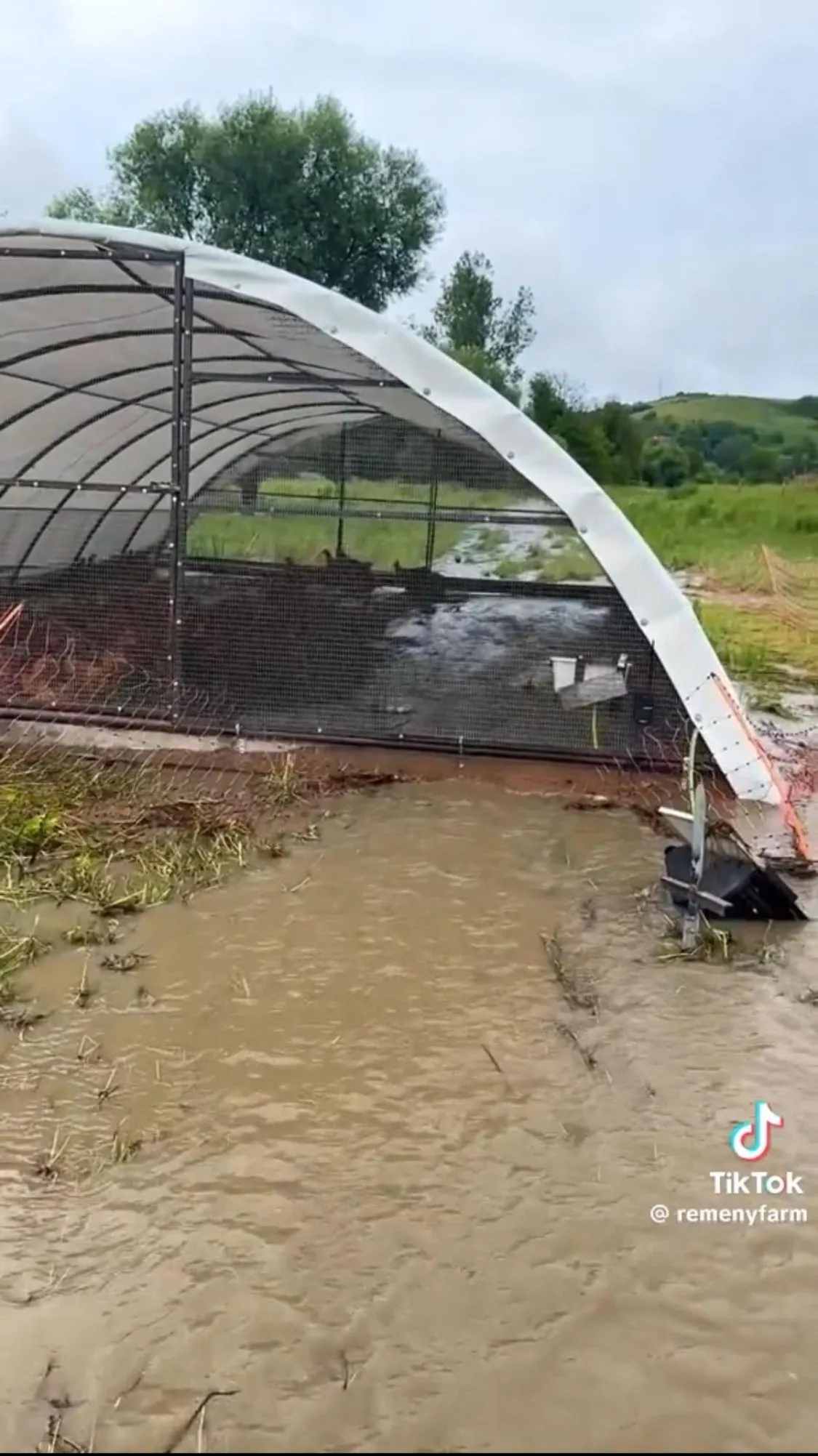 Ilyen esőzést még nem láttunk. Sajnos nem csak az épületeket, de az állatokat is elmosta. A csirkékhez ládákat és raklapokat raktunk be gyorsan, hogy száraz helyen lehessenek; másnap pedig magasabb helyre küldtük őket. Hál' égnek veszteség nem volt, bár eléggé eláztak szegénykék