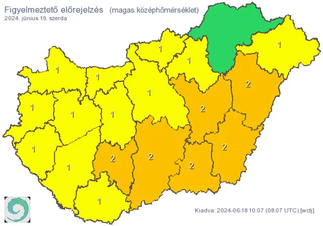 Szerdán szinte zavartalan lesz a napsütés. Országossá válik a kánikula, délután 30-36 fok lesz. A HungaroMet Nonprofit Zrt. már másodfokú riasztást is kiadott a hőség miatt Bács-Kiskun, Békés, Csongrád-Csanád, Hajdú-Bihar, Jász-Nagykun-Szolnok és Tolna vármegyére. Ezeken a területeken a napi középhőmérséklet 27 fok felett alakulhat. Elsőfokú riasztást kapott a 25 fok feletti napi középhőmérséklet miatt Pest, Baranya, Fejér, Győr-Moson-Sopron, Heves, Komárom-Esztergom, Nógrád, Somogy, Szabolcs-Szatmár-Bereg, Vas, Veszprém és Zala vármegye.