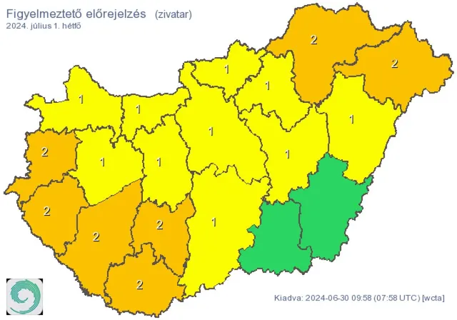 Kedden napos idő lesz gomolyfelhőkkel, keleten egy-egy záporral. Friss, kellemes nyári idő valószínű 25 fok körüli maximumokkal - írja a Köpönyeg. Aznapra Békés, Borsod-Abaúj-Zemplén, Csongrád-Csanád, Hajdú-Bihar, Heves, Szabolcs-Szatmár-Bereg és Jász-Nagykun-Szolnok vármegye kapott citromsárga riasztást a zivatarok miatt.