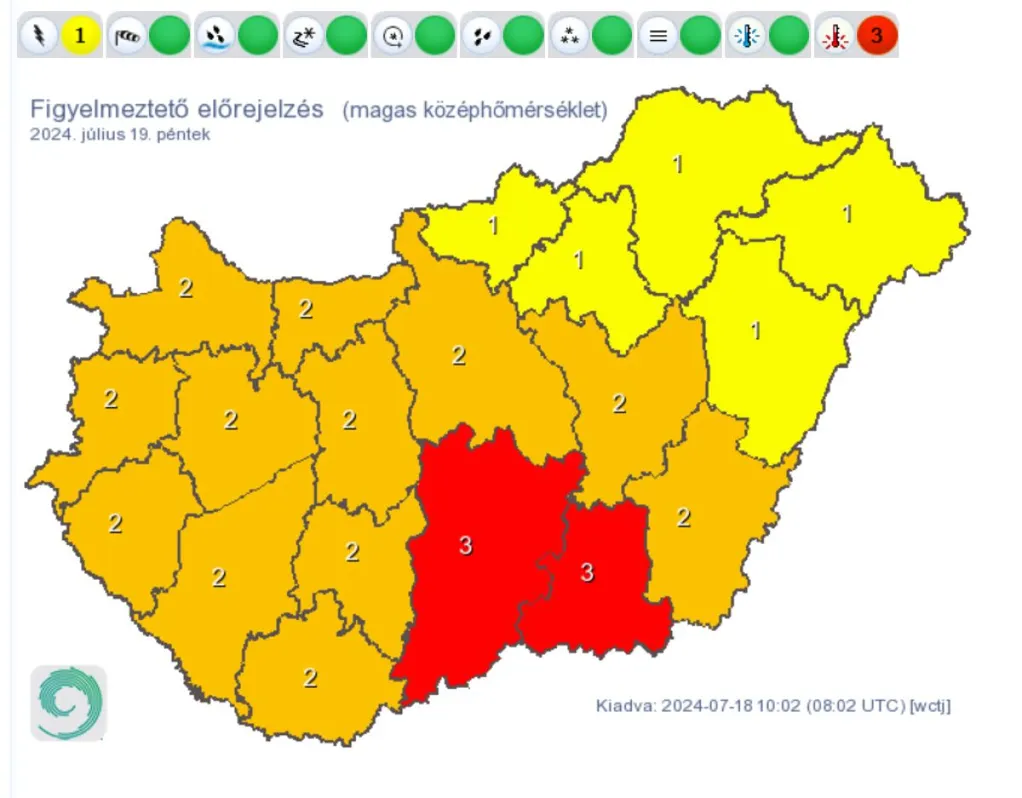 30 fok feletti forróságra hívta fel a figyelmet a HungaroMet Nonprofit Zrt. A veszélyjelzésükben a mai napon két vármegye kapott harmadfokú, vörös riasztást a magas középhőmérséklet miatt: ezeken a területeken a napi középhőmérséklet 29 °C felett alakulhat. Az ország további részén citromsárga vagy narancssárga riasztás van érvényben, mialatt néhány vármegye zivatar miatt is citromsárga figyelmeztetést kapott.