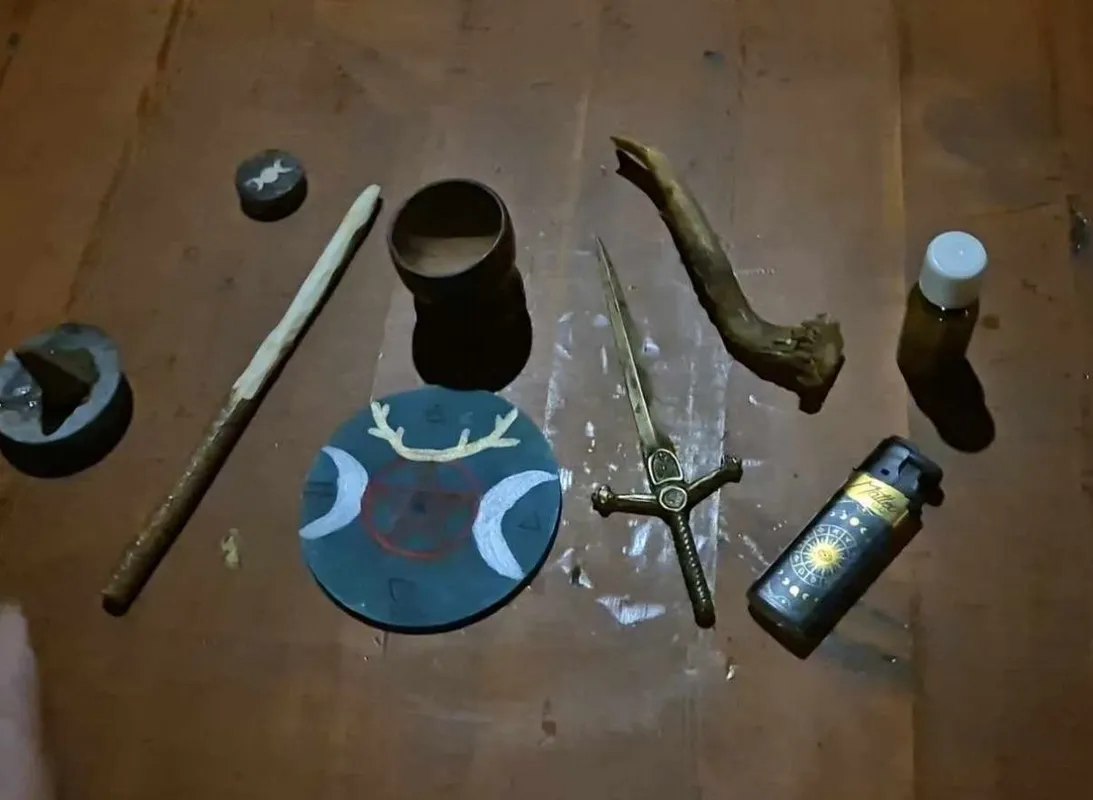 Amit itt látunk, az egy wicca-boszorkányoltár. Az egyik fontos kellék a földelemet szimbolizáló pentákulum, a levegőt jelképező tőr, a tüzet megjelenítő pálca és a vízelemet jelképező kehely