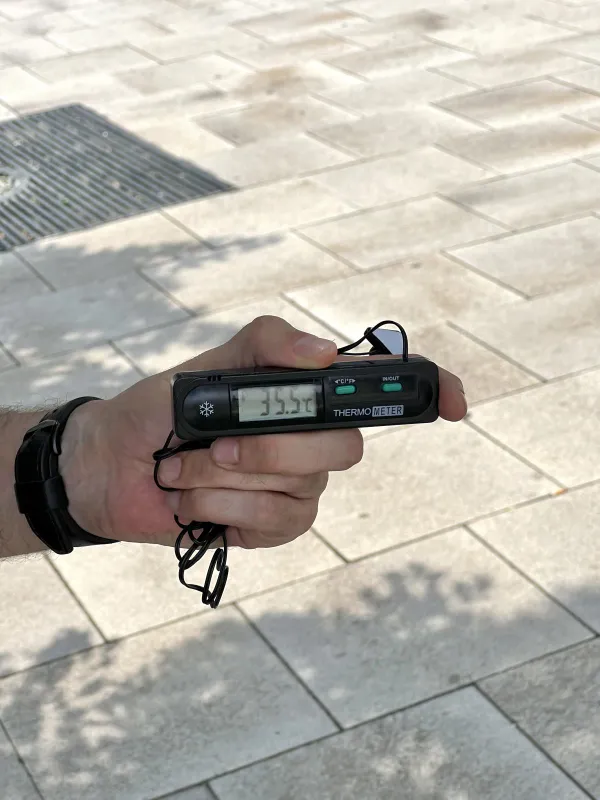 Feltűnt, hogy a máskor oly népszerű utcabútorok közül a Blaha forgószékei most üresek voltak. Nem ok nélkül: megmértük, és az ülőfelületük több, mint 50 fokra forrósodott fel a tűző napon. Gyorsan követtük is a jó példát és árnyékba húzódtunk, ahol némi akklimatizálódás után jött a következő sokk: az újabb mérés azt mutatta: 35 fok ban az árnyékban.