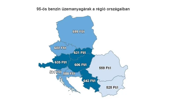 A Központi Statisztikai Hivatal (KSH) legutóbb múlt pénteken tette közzé jelentését az EU Weekly Oil Bulletin legfrissebb adatai alapján. Ezek szerint Magyarországon a 95-ös oktánszámú motorbenzin átlagára 606 forint volt, ami 10 forinttal, 1,7%-kal magasabb a régiós átlagértéknél. A szomszédos országokban az átlagár 606 forint volt, a magyar árral megegyezett.