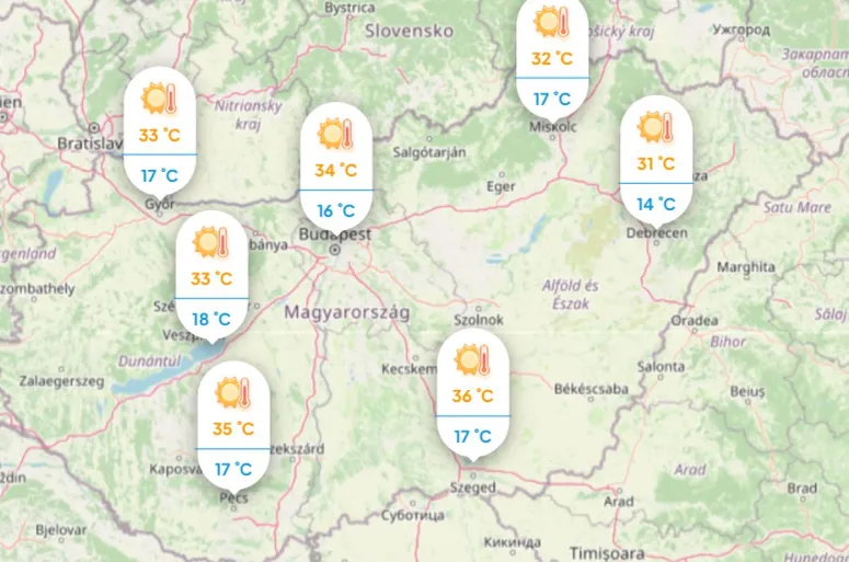 A hétvégével megérkezik a jövő hét közepén csúcsosodó 39-40 fokos kánikula előszele, aminek köszönhetően szombaton és vasárnap is túlnyomóan napos strandidő várható. Csapadék nem lesz, az tökéletes időjárást maximum egy-egy gomolyfelhő zavarhatja majd csak meg. És habár szombat napközben az északnyugati szél megélénkülhet, a hőmérséklet így is bőven 30 fok fölé melegszik, van ahol elérheti a 36 fokot is. Emiatt pedig a HungaroMet első fokú hőriasztást adott ki Baranya, Bács-Kiskun, Csongrád-Csanád, Somogy és Tolna vármegyére a következő figyelmeztetéssel:
