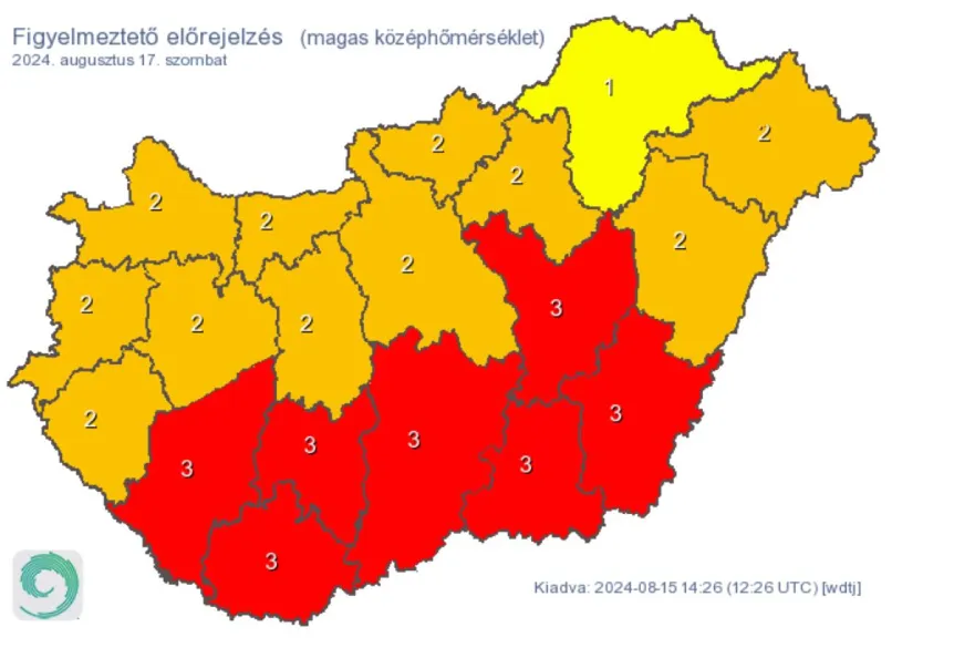 Szombaton, augusztus 17-én délutánig marad a strandidő sok napsütéssel, majd délutántól magasra törnek a gomolyok, és szórványosan törnek ki zivatarok. Estétől ÉNy-ira fordul és megerősödik az ÉNy-i szél. Még mindig rekkenő hőség lesz, akár 40 fok is lehet. Ha a csapadék nem lenne elég, még a hőmérséklet is pokoli lesz, a kánikula miatt a Magyar Meteorológiai Szolgáltató Nonprofit Zrt. az ország déli részére harmadfokú vörös riasztást adott ki, az ország többi részére pedig szinte mindenhova másodfokú figyelmeztetést.