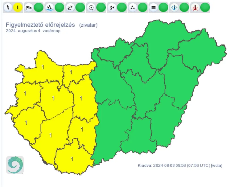 A HungaroMet Nonprofit Zrt. veszélyjelzésében a mai napra csaknem a fél országra citromsárga riasztást adott ki a zivatarok miatt: az érintett területeken az elsődleges veszélyforrást a villámlás jelenti, emellett esetenként szélerősödés, jégeső is előfordulhat!