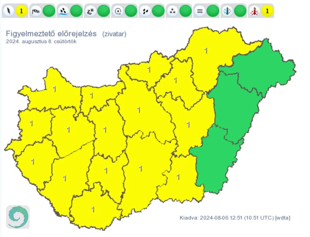 Csütörtökre az ország legnagyobb részére citromsárga riasztást adott ki a HungaroMet Nonprofit Zrt. a zivatarok miatt, valamint figyelmeztetést kapott néhány vármegye a magas középhőmérséklet miatt is.