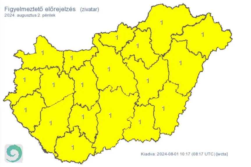 Péntekre az ország teljes területére citromsárga figyelmeztetést adott ki a Magyar Meteorológiai Szolgáltató Nonprofit Zrt. a zivatarok miatt.