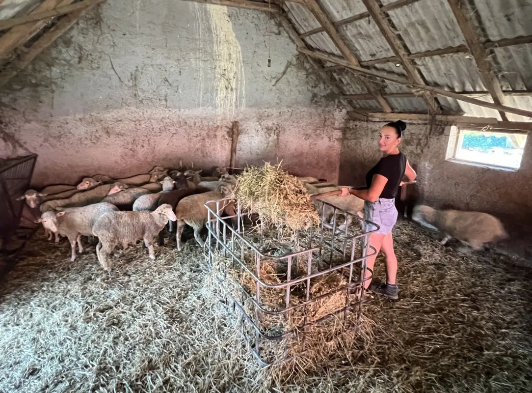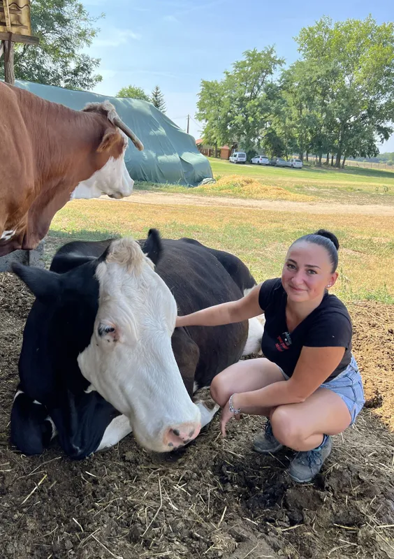 A 10 hektáros területen szabadtartásban él, tehén, borjú, birka, bárány, csirke, malac, cica és kutya is. A 20 éves lány nem fél bepiszkolni a kezét a munkában és traktort is kitűnően vezet.