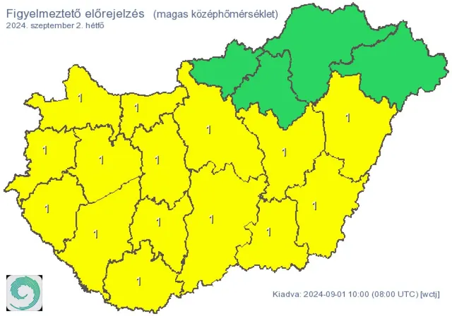 Hétfőn napos, száraz időben zajlik az iskolakezdés. A délutáni órákban 31-36 fok közötti hőmérsékletre lehet számítani, csapadék nem várható. A HungaroMet Nonprofit Zrt. elsőfokú hőségriasztást adott ki Pest, Baranya, Bács-Kiskun, Békés, Csongrád-Csanád, Fejér, Győr-Moson-Sopron, Hajdú-Bihar, Komárom-Esztergom, Somogy, Jász-Nagykun-Szolnok, Tolna, Vas, Veszprém és Zala vármegyére. Az országos tisztifőorvos a meteorológiai szolgálat előrejelzése alapján az augusztus 24-én, szombaton 00.00 órától kiadott másodfokú hőségriasztást szeptember 5-én, csütörtökön 24.00 óráig meghosszabbította az ország egész területére.