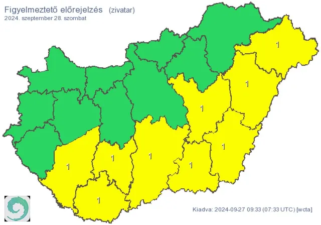 Szombaton, szeptember 28-án az ország középső és keleti területen többfelé fordul elő eső, zápor. A Dunántúlon változóan felhős, főleg délután már napos idő valószínű. A szél sokfelé megerősödik, erős lehűlés várható: délelőtt 20, délután már csak 17 fok körüli értékeket mérhetünk. A HungaroMet Nonprofit Zrt. elsőfokú riasztást adott ki a zivatarok miatt Baranya, Bács-Kiskun, Békés, Csongrád-Csanád, Hajdú-Bihar, Somogy, Szabolcs-Szatmár-Bereg, Jász-Nagykun-Szolnok és Tolna vármegyére. Ezeken a területeken elsődleges veszélyforrást jelent a villámlás, emellett esetenként szélerősödés, jégeső előfordulhat! Az eső miatt is citromsárga riasztás van érvényben Baranya, Békés és Csongrád-Csanád vármegyében, ami azt jelenti, hogy az érintett területeken 24 óra alatt több mint 20 mm csapadék hullhat.