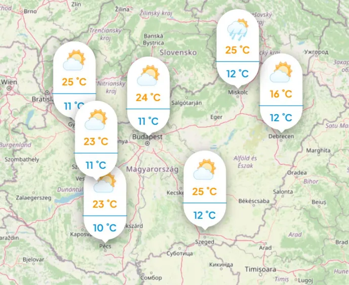 Szerdától tovább melegszik a levegő hőmérséklete, a héten már tényleg búcsút mondhatunk az elmúlt héten megszokot 10 foknak és zuhogó esőnek. Változóan felhős időre számíthatunk, de kicsi az esély csapadékra, miután többórás napsütés várható. A szél azonban megélénkül több helyen is. A legmagasabb nappali hőmérséklet 21-26 fok között várható.