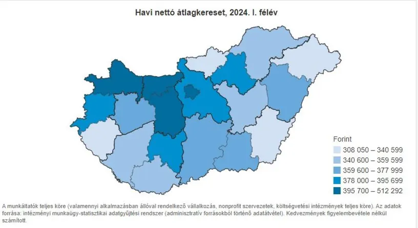 Budapesten volt a legnagyobb az átlagkereset (512 292 forint), a legalacsonyabb pedig Szabolcs-Szatmár-Bereg vármegyében (308 050 forint).