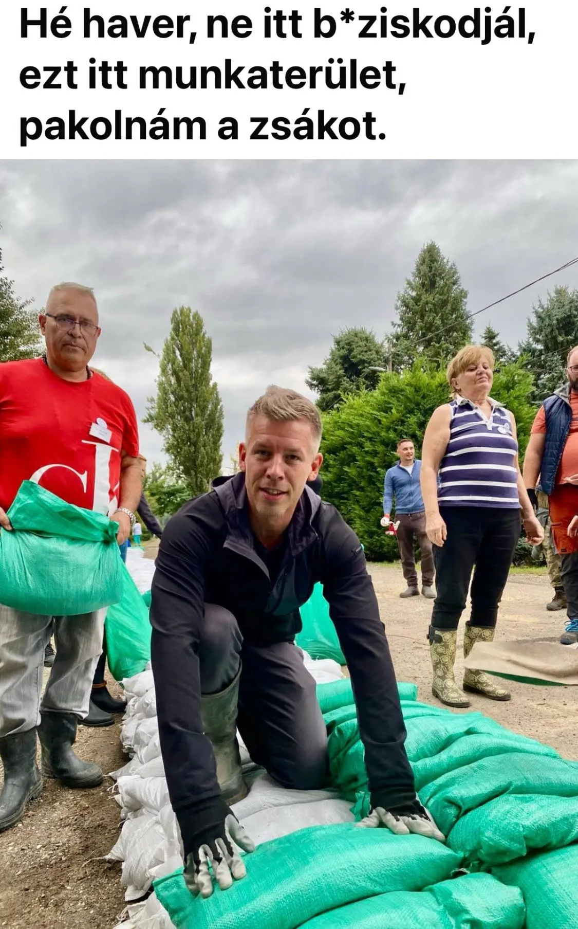 Olyan kép is van, amelyen homokzsákon guggol patyolattiszta kesztyűjével, miközben mögötte az önkéntesek valóban szeretnének haladni a védekezéssel.