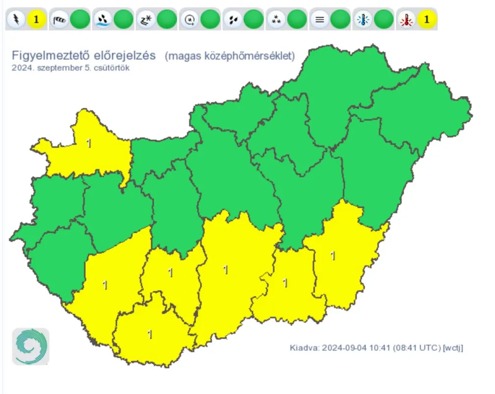 Az időjárás-előrejelzés szerint csütörtökön továbbra is forró időre készülhetünk, sok napsütéssel: a hőmérséklet akár 36-37 fokig is emelkedhet. Az időjárás száraz lesz, csapadék nem várható. A szél gyenge marad, így a meleg hatása tovább fokozódhat. A HungaroMet Nonprofit Zrt. veszélyjelzésében ismét több vármegye kapott citromsárga riasztást a magas középhőmérséklet miatt.