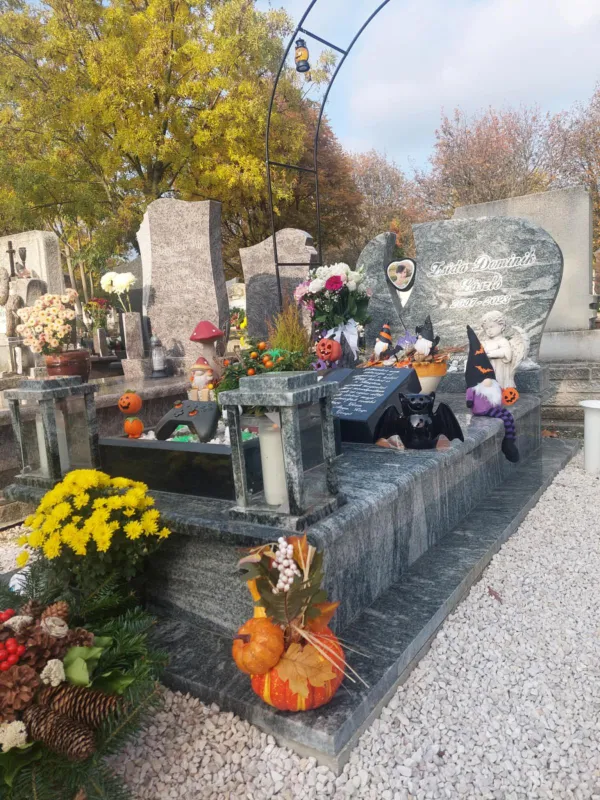 Dominik nem magát a halloweent mint ünnepet szerette, hanem azt, hogy olyankor kidekoráltuk a házat és itt, nálunk, a XVII. kerületben meg van szervezve a «rosszcsontok éjszakája», ami annyit takar, hogy a gyerekek beöltöznek és mennek csokit gyűjteni a házakhoz. Sajnos idén már nem fog menni, ahogyan tavaly sem, de a sírköve dekorálását meg tudom csinálni hasonlóan, ahogyan az itthoni dekorációt szerette