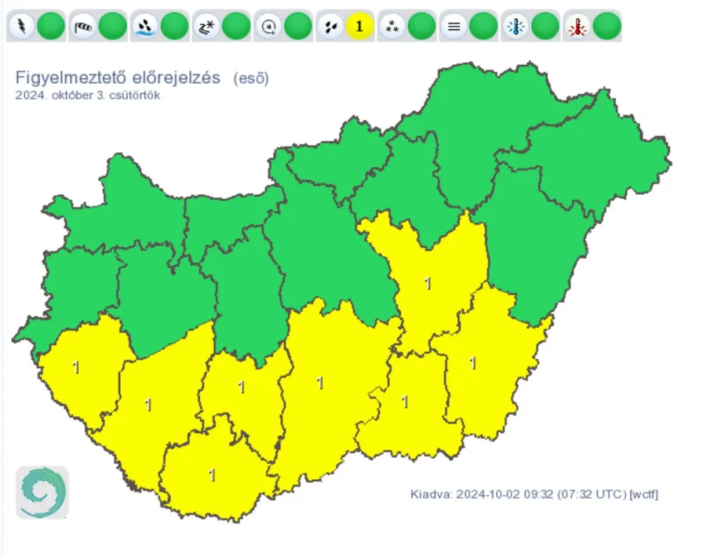 Az időjárás-előrejelzés szerint csütörtökön marad a borongós idő. Reggel, majd a napközbeni szünet után estétől valószínű újabb eső, záporeső. Az ÉK-i szél egyre inkább megélénkül, és 15 fok körüli értékeket mérhetünk. A HungaroMet Nonproft Zrt. veszélyjelzésben is az esőre hívták fel a figyelmet: a citromsárga riasztást kapott területeken 24 óra alatt több mint 20 mm csapadék hullhat.